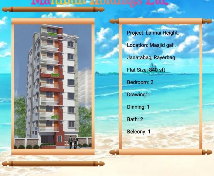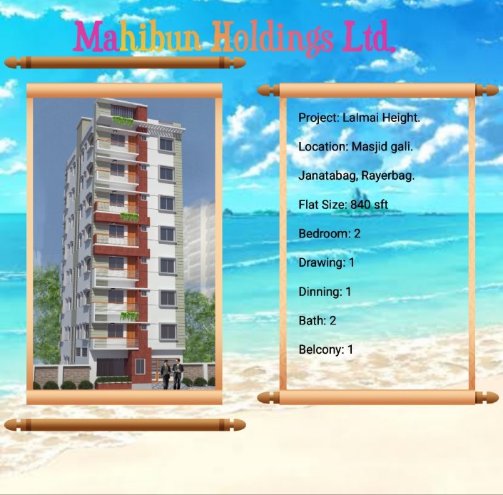 PROPERTY FEATURES Property Name: Lalmai Height Property Type: Apartment / Flat Property For: Sale Property Location: Rayerbag Construction Status: Under Construction Property Size: 840 Sft Bedroom: 2 Bathroom: 2 Balconies: 1 Drawing/Dinning: Separate Total Floor: G+7…