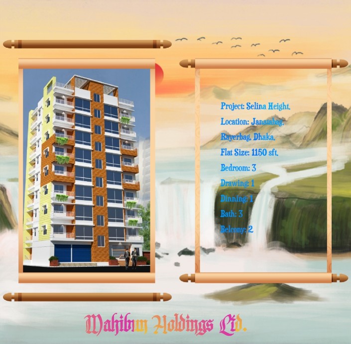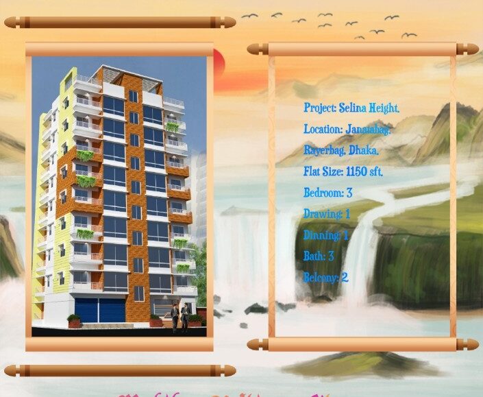PROPERTY FEATURES Property Name: Selina Valley Property Type: Apartment / Flat Property For: Sale Property Location: Rayerbag, Jorakhamba Chowrasta. Construction Status: Under Construction Property Size: 1150 Sft Bedroom: 3 Bathroom: 3 Balconies: 2 Drawing/Dinning: Drawing…